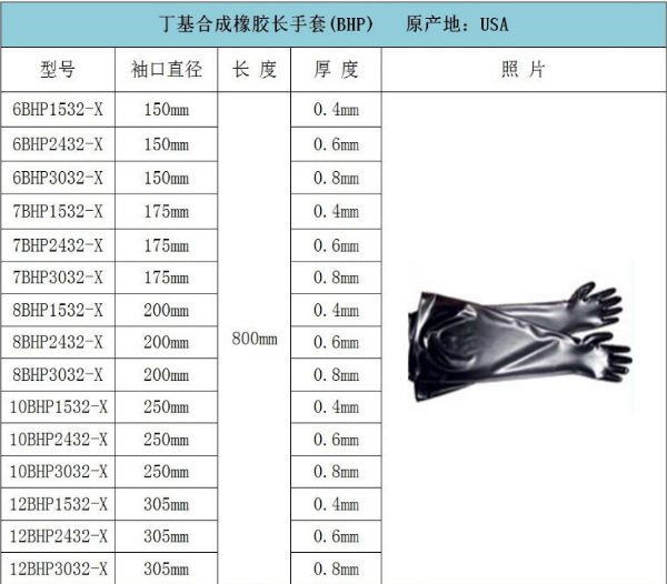 BHP手套原產美國,本產品主要配套手套箱、操作箱、干燥箱、隔離器、注液機生產線等使用。可配套進口手套箱,如:德國布勞恩手套箱、美國VAC手套箱、韓國高麗技研手套箱;各類國產手套箱。常用于核電,防御,生物技術,半導體和制造業(yè)中的干箱操作,特別適合在有高度有毒化學品危害的條件下使用,例如化學武器。該產品因具有良好的防水、氧氣體滲透的功能,目前在電池生產、材料研發(fā)領域使用較為廣泛。